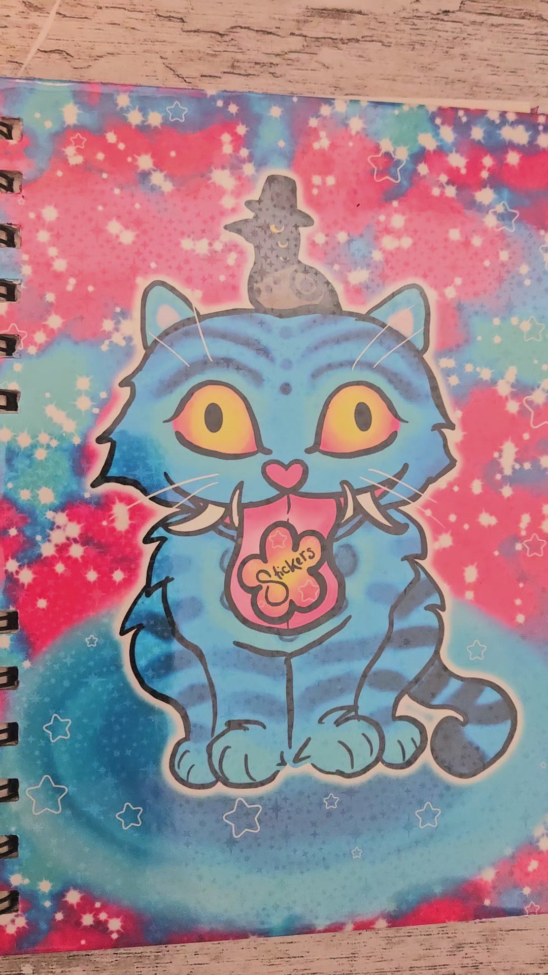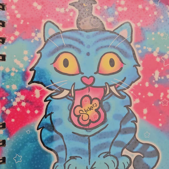 Blue Silly Tiger and bird with hat Sparkly Reusable sticker book for sticker hoarders (hard back)